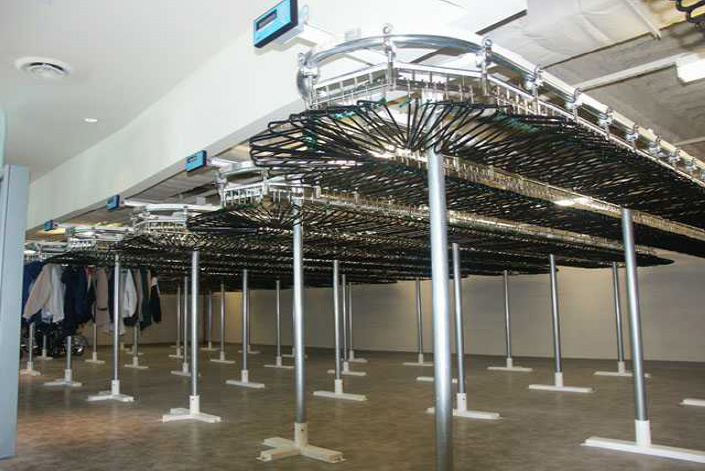 Конвейер для одежды может вращаться во все стороны, чтобы максимально быстро и по кратчайшему пути доставить необходимую вещь. Специальные номерки с чипами соответствуют определенным вешалкам на конвейере, поэтому ошибка здесь исключается.