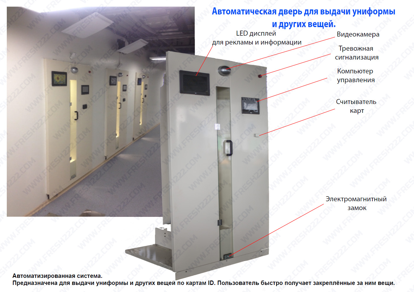 Склад униформы (спецодежды)– это «умная» система хранения, выдачи и приема вещей, которая автоматически контролирует весь процесс и персонально фиксирует полученную и сданную сотрудником спецодежду, исключая кражи и путаницу. Для этого у каждого сотрудника есть индивидуальная RFID радиочастотная карта.