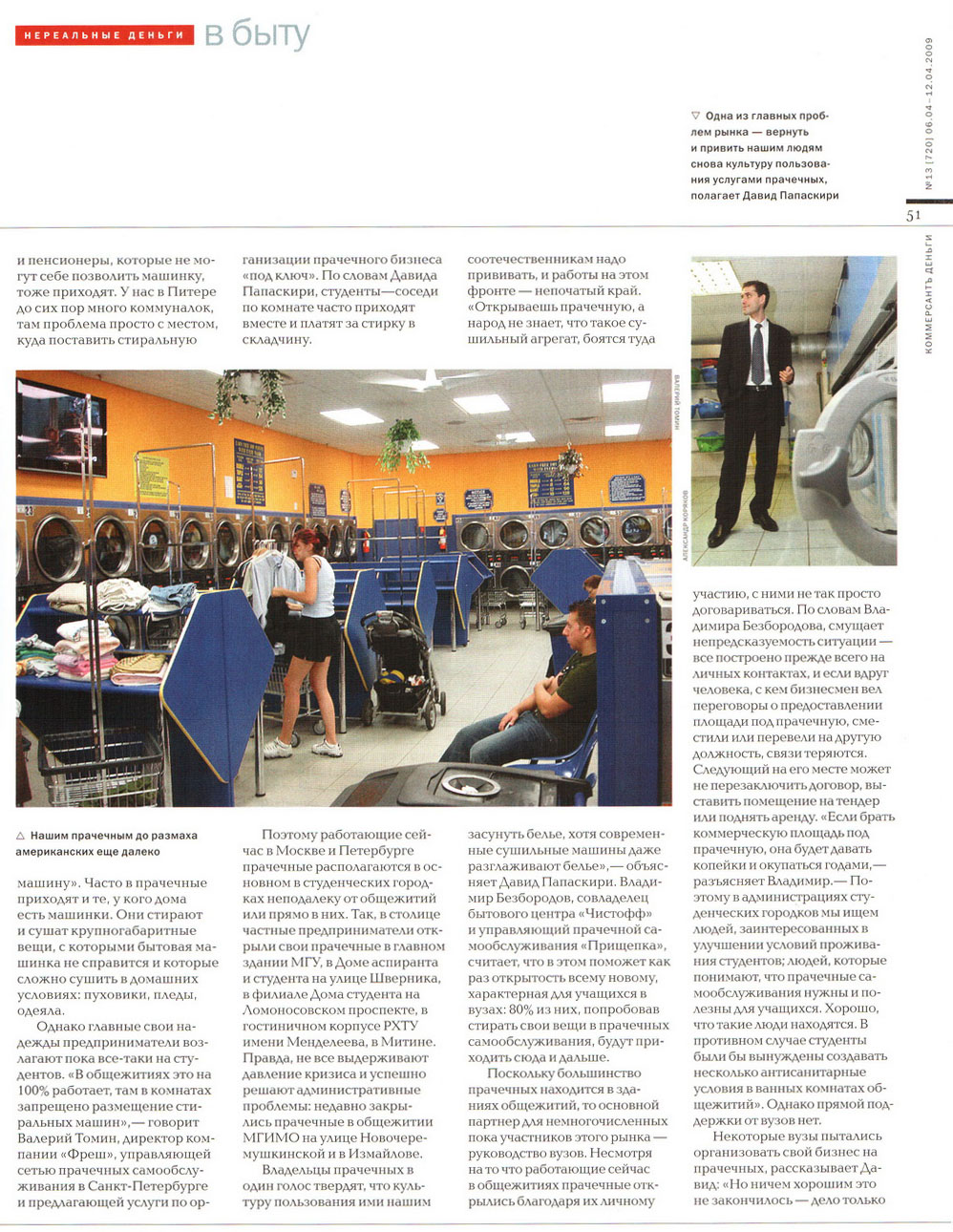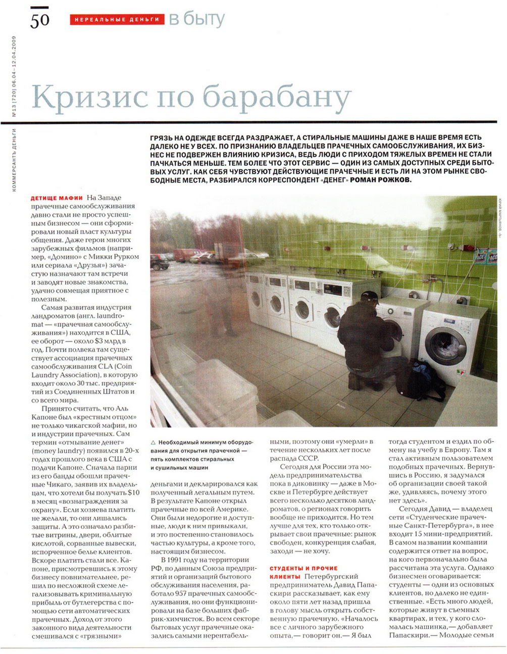 Петербургский предприниматель Давид Папаскири рассказывает, как ему около пяти лет назад пришла в голову мысль открыть собственную прачечную. "Началось все с личного зарубежного опыта,— говорит он.— Я был тогда студентом и ездил по обмену на учебу в Европу. Там я стал активным пользователем подобных прачечных. Вернувшись в Россию, я задумался об организации своей такой же, удивляясь, почему этого нет здесь".